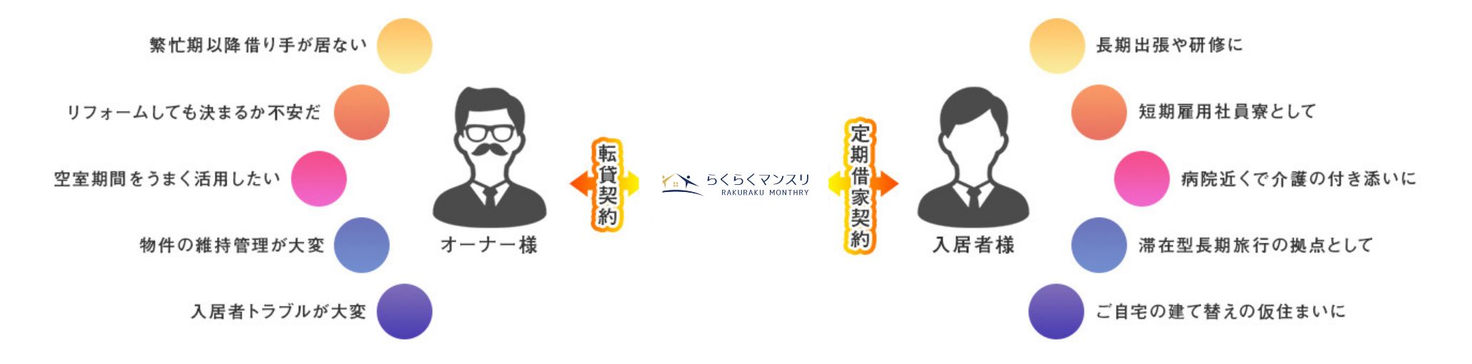 らくらくマンスリーはお預かりした物件に、入居希望者様がすぐに生活をスタートできるよう家具・家電等はもちろんの事、生活備品をセットし運営いたします。実店舗やインターネットを通し入居者様の募集から、審査及び契約まで安心しておまかせください。